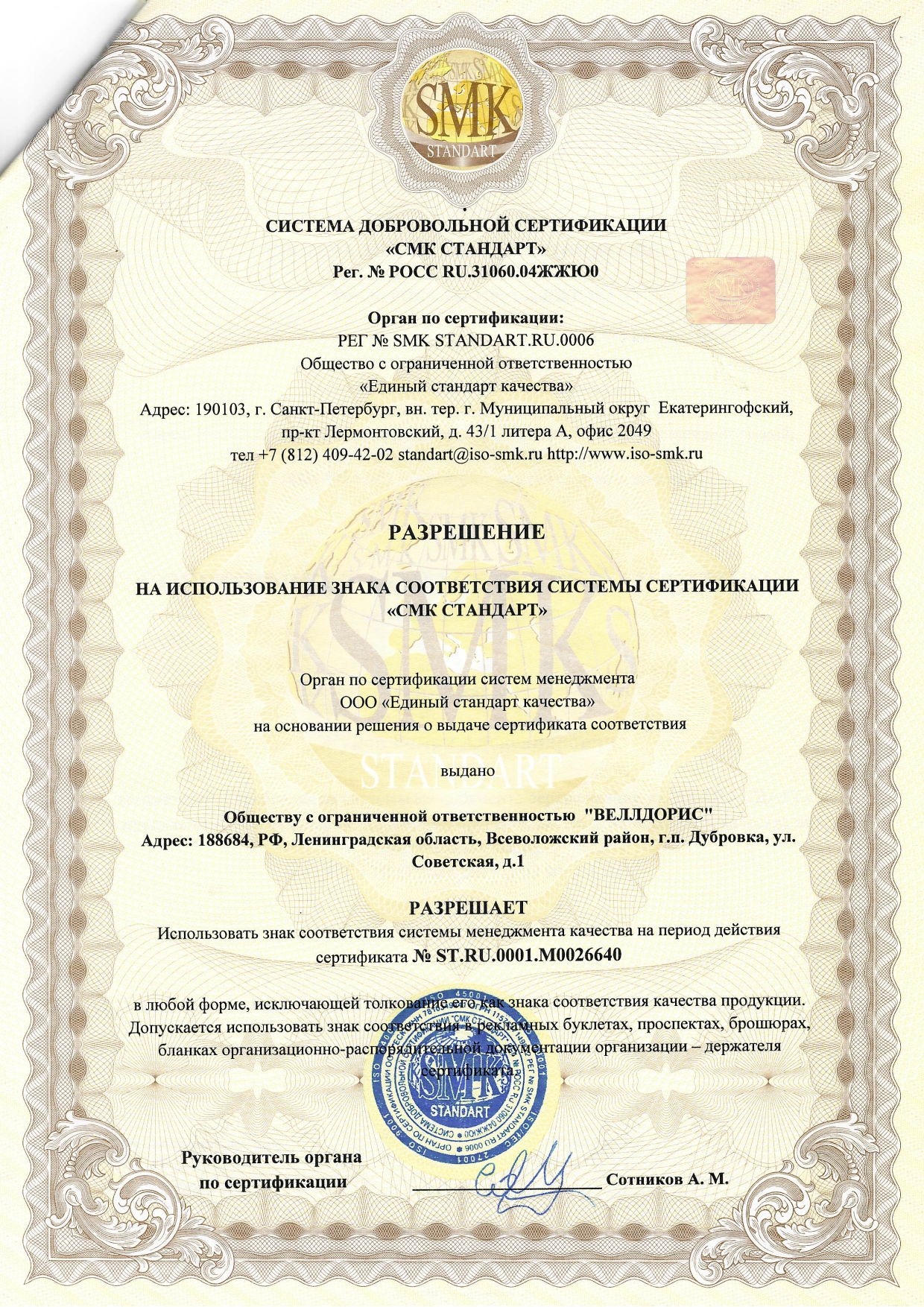 Вся продукция, производимая компанией VellDoris имеeт все необходимые сертификаты, подтверждающие их полное соответствие действующим требованиям ГОСТ и ТУ.